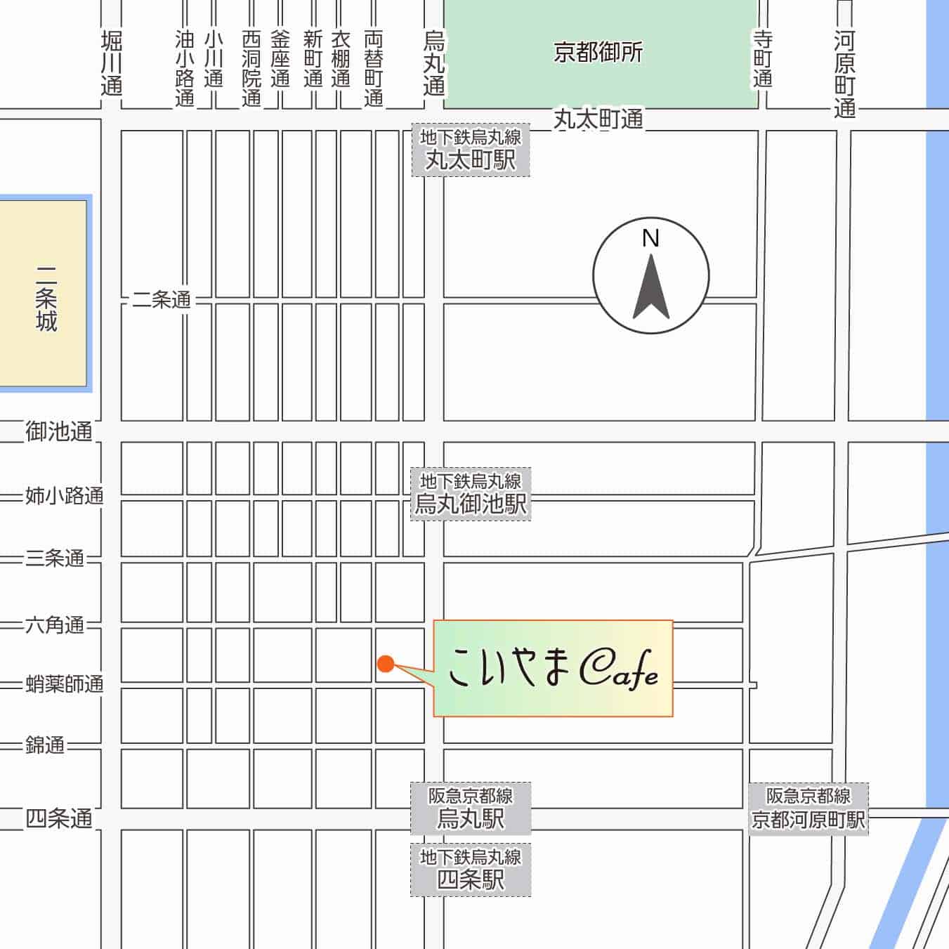 こいやまCafeは、京都市営地下鉄烏丸線「四条駅」・阪急京都線「烏丸駅」・京都市営地下鉄東西線「烏丸御池駅」から徒歩5分。 京都駅から地下鉄で一本という好立地。近くにコインパーキングも多数ございます。