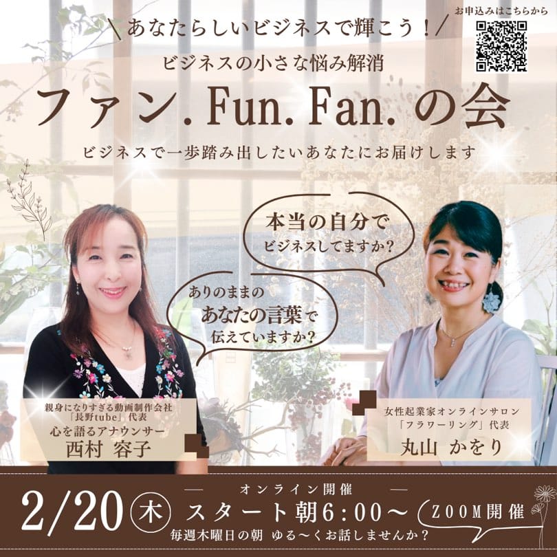 2月20日(木)朝6時より 「ファン・FUN・FANの会」がスタート! 動画制作会社経営の、心を語るアナウンサー 「長野tube」代表西村容子と、 起業家オンラインスクール経営、 商品構築/セールスコンサルタント 「フラ […]
